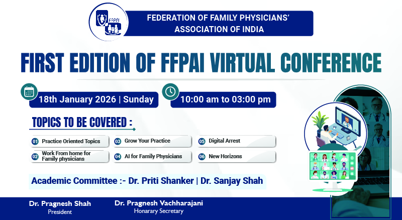 FFPAI is a convenient acronym comprising the first five initials of the Federation of Family Physicians' Associations of India, an organization to which Medical Associations of General Practitioners/Family Physicians from different parts of India are affiliated as UNITS. FFPAI, for practical purpose, is Indian Organization of Family Doctors.